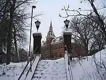 The 50-acre (20 ha) main campus is located at the highest point in New Ulm, between Hermann Heights Monument and Flandrau State Park.[4] Most of MLC's academic and administrative operations are located within the college's Old Main, dedicated in 1884, the Wittenberg Collegiate Center, dedicated in 1928, and the Link, connecting Old Main to the Wittenberg Collegiate Center, dedicated in 1995.[80][81] The Old Main was added to the National Register of Historic Places in 1979, after being nominated as a leading example of Gothic Revival architecture in Minnesota and a distinctive symbol of local religious education.[82] The main campus also includes the Luther Student Center, Music Hall, Music Center, the 1200-seat Chapel of the Christ, a 900-seat auditorium (within the Wittenberg Collegiate Center), a gymnasium, a library, four residence halls, and several faculty homes.[4] The college's library cooperates with the Traverse des Sioux Library System.[83]