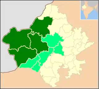Dark green indicates primary Marwari-speaking region, light green indicates additional dialect areas who count themselves as Marwari