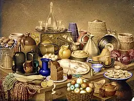 Contrary to the common practice of her day, Mary Ellen Best was interested in portraying domestic life in her paintings, including families at tables, kitchens and domestic workers.[4] She painted a number of water-colour images of her home in Castlegate, York, including interior portraits of the drawing room, dining room (painted in 1838), and one of herself working in her painting room. She also painted other houses including the drawing room of Naburn Hall, which was then home to George Palmes. After marrying Johan Anton and moving to Nuremberg, Frankfurt, Worms and Darmstadt, she continued to paint the houses they lived in.[3]