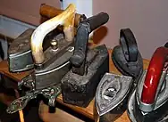 The most pronounced feature of Potts's clothes iron was the detachable rounded wooden handle.[12] That allowed the iron base to be placed on a heated stovetop and the handle removed at that time to stay away and cool while the base heated up.[13] This prevented burned fingers, that often happened with the conventional all-solid-metal clothes iron of the 19th century.[14] The design of the handle and bases were standard and could be easily reattached to various sizes after they were heated for a little delay in ironing.[7]