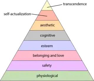 Maslow's hierarchy of needs is often portrayed in the shape of a pyramid, with the largest, most fundamental needs at the bottom, and the need for self-actualization and transcendence at the top. In other words, the idea is that individuals' most basic needs must be met before they become motivated to achieve higher-level needs.[14] Despite the fact that the ideas behind the hierarchy are Maslow's, the pyramid itself does not exist anywhere in Maslow's original work.[15]