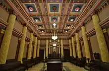 The current building was designed by Harry P. Knowles, one of the architects of the New York City Center. It actually consists of two interconnected buildings, one (constructed in 1913) on the corner of 23rd St and 6th Avenue, and the other (constructed in 1907) facing 24th St. The 23rd St. building is primarily a commercial office building, with rents generating funds for the Grand Lodge's charitable activities and the upkeep of the 24th Street building. The 24th St. building consists primarily of lodge meeting rooms, including the 1200-seat Grand Lodge Room, all elaborately ornamented. The Hall's interior was restored in 1986-96 by Felix Chavez, Fine Art Decorating.[1]
