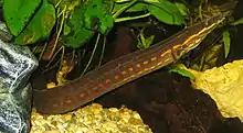Mastacembelus is a genus of many species of spiny eel fish from the family Mastacembelidae. They are native to Africa (c. 45 species) and Asia (c. 15 species).[4] Most are found in rivers and associated systems (even in rapids[5]), but there are also species in other freshwater habitats and a particularly rich radiation is found in the Lake Tanganyika basin with 15 species (14 endemic).[6][7] A few species can even occur in brackish water.[8]