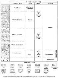 After founding the geology department at the University of Oklahoma in 1900, Charles N. Gould worked summers doing field work for Frederick Haynes Newell, first director of the United States Reclamation Service (later known as the United States Bureau of Reclamation), investigating "the underground water resources of a portion of the southern part of the Great Plains."[28] His first summer trip through the Panhandle in 1903 resulted in Water Supply Paper 154 of the United States Geological Survey, Geology and Water Resources of the Eastern Portion of the Panhandle of Texas, and a similar trip in 1905 resulted in Water Supply Paper 191, Geology and Water Resources of the Western Portion of the Panhandle of Texas.[29] It was during this second trip Gould "explored and prepared a geological map of Palo Duro Canyon...giving names to the formations" and "studied the anticlines along the Canadian River, indications of which he saw in 1903.[30]
