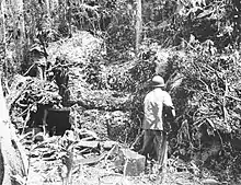 On the morning of 2 November, with the Whaling Group covering their flank, the men of 2/5 marched north and reached the coast west of Point Cruz, completing the encirclement of the Japanese defenders. The Japanese defenses were centered in a draw between a coastal trail and a beach just west of Point Cruz and included coral, earth, and log bunkers as well as caves and foxholes. U.S. artillery bombarded the Japanese positions throughout the day on 2 November, causing an unknown number of casualties to the Japanese defenders.[27]
