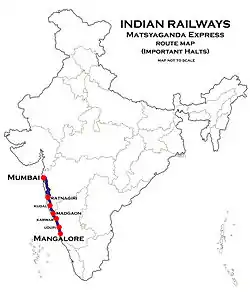 The 12619/20 Matsyagandha Superfast Express is a daily Superfast Express train running between Lokmanya Tilak Terminus (Mumbai) and Mangaluru Central.[1] The train was introduced on 1 May 1998 as Mangalore-Kurla Express.[2] The Matsyagandha Express travels through some of the very difficult terrains of India.[3] Matsyagandha Express ( Train number 02619 run as special) travelling from Lokmanya Tilak Terminus, Mumbai (LTT) to Mangaluru Central became first train to take Roha-Veer double line on Konkan railway route on 30 August 2021 at 7.30p.m.[4]