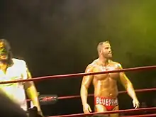 Morgan returned to WWE on the April 21, 2005, episode of SmackDown!, with a new gimmick as a stuttering big-man who was defensive over his speech disorder, and quickly defeated a then-unknown jobber, Brett Matthews.[20] On the May 19 episode of Smackdown!, he allied himself with Carlito and became his "backup".[21] Morgan helped Carlito defeat Big Show at Judgment Day, using Lesnar's former finisher, the F-5.[22][23] This partnership ended when Carlito was drafted to Raw,[24] and Morgan was subsequently released by WWE on July 5, 2005.[25][26] His last match in WWE was on the July 7, episode of SmackDown! against William Regal, although technically the match never took place as Morgan was attacked by The Mexicools before Regal ever got to the ring.[27]