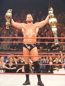 On the January 4, 2010, live, three-hour, Monday night episode of Impact! Morgan and Hernandez defeated Dr. Stevie and Raven to become the number one contenders to the TNA World Tag Team Champions British Invasion (Brutus Magnus and Doug Williams) at Genesis.[51] At the pay-per-view Morgan and Hernandez defeated the British Invasion to win the TNA World Tag Team Championship, his first major championship.[52] At Against All Odds as part of the 8 Card Stud Tournament Morgan and Hernandez were forced to face each other in the first round. Morgan defeated Hernandez by taking advantage of his injured shoulder and pinning him, while grabbing a hold of his trunks. However, in the semifinals Morgan was defeated by the eventual winner of the entire tournament, D'Angelo Dinero.[53] At Destination X Morgan and Hernandez retained the Tag Team Titles in a match against Beer Money despite plenty of miscommunication between the two champions. After the match Morgan nailed Hernandez with the Carbon Footprint and left with both title belts, turning heel in the process.[54] The following day on Impact! Morgan defeated Hernandez via referee stoppage after sandwiching his head between his boot and the ring post, putting him out of action indefinitely.[55] With Hernandez scheduled to miss months of action, Morgan declared himself the sole World Tag Team Champion on the edition of April 5 of Impact! and TNA went along with this and recognized him as the sole Champion.[56] Morgan then went on to successfully defend the World Tag Team Title while teaming with the likes of Amazing Red, Shark Boy and Jesse Neal as his substitute partners, attacking each of them after the matches.[57][58][59] On the edition of May 3 of Impact! it was announced that Morgan would defend the World Tag Team Championship at Sacrifice against Jesse Neal and Shannon Moore, both of whom he had attacked in the two previous weeks, and that Hulk Hogan would decide his partner for the match.[60] On the edition of May 13 of Impact! Morgan demanded to find out who his partner would be and when he did not get an answer, threatened to turn his match against Generation Me (Jeremy and Max Buck) into a bloodbath. However, Samoa Joe came to the ring to put a stop to this and hit Morgan with a Muscle Buster. This led to The Band coming out and Kevin Nash cashing in his "Feast or Fired" contract, after which he pinned Morgan to make himself and Scott Hall the new World Tag Team Champions.[61] On the edition of June 3 of Impact!, Matt Morgan was distracted by somebody in the crowd which cost him a four-way match with Samoa Joe, Sting, and the winner of the match, TNA World Heavyweight Champion Rob Van Dam. The camera's immediately showed what was distracting Morgan, but nobody could clearly see who it was, although Taz and Mike Tenay believed it to be Hernandez.[62] The following week, Hernandez made his official return by attacking Morgan. After the attack The Band gave the injured Morgan the rematch he had wanted for the World Tag Team Championship and easily defeated him to retain the title.[63] At Slammiversary VIII Morgan defeated Hernandez via disqualification, when Hernandez was disqualified for shoving the referee, when he had gotten enough of him reprimanding him for going after Morgan.[64] The following month at Victory Road Morgan was defeated by Hernandez in a Steel Cage match.[65]
