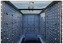 Sarcophagus (2016), exhibited at the 15th Venice Architecture Biennale invited audiences to experience an immersive environment of simulated sleep-states. This multidimensional architectural installation renders creative curiosities of biological and induced respite, challenging a range of aesthetic, cultural and behavioural concerns. Users are invited to physically occupy the installation offering an unusual interactive experience. The environment is dynamic with the interior transforming with the aid of a multichannel film, filling the intimate chamber with abstract cinematic and meditative sound and imagery.[9]