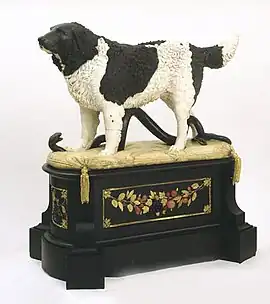 In 1831 Lord Dudley commissioned Wyatt to sculpt his favourite hound Bashaw, offering to pay the then astronomical sum of 5,000 guineas for the finished work. Bashaw was taken to Wyatt's studio in London around 50 times to sit for the sculptor. Lord Dudley donated Persian topaz and sardonyx from the family jewel collection for the sculpture's eyes. However, Lord Dudley died in 1833 before it was completed and his executors refused to pay Wyatt his fee, so he retained the sculpture, exhibiting it several times, including at The Great Exhibition of 1851.[7]