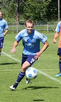 In 2005, he returned to Sweden to play for Djurgårdens IF.[5] In his first season with the club, he helped Djurgårdens IF win the Double of both the 2005 Allsvenskan and Svenska Cupen trophies. He started the tournament as a substitute, but was included in Sweden's starting line-up for the final two games before elimination. He ended his national team career in August 2006.[6] Jonson ended his career after the 2011 season, and played his last game on 23 October 2011.