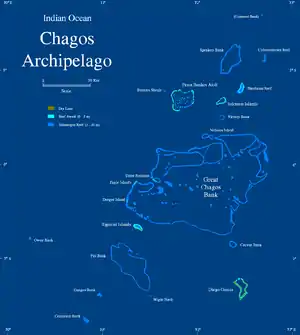 In 1965, the UK split off the Chagos Archipelago from Mauritian territory to the British Indian Ocean Territory (BIOT).[20] The local population was forcibly expelled between 1968 and 1973 and the largest island, Diego Garcia, was leased to the United States.[21] The sovereignty of the Chagos is disputed between Mauritius and the UK. In 2019, the International Court of Justice issued an advisory opinion ordering the UK to return the Chagos Islands to Mauritius, and in 2021, the International Tribunal for the Law of the Sea ruled in support of this, saying that the UK has "no sovereignty over the Chagos Islands".[22]