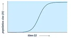 can be understood as the change in population (N) with respect to a change in time (t). Equation 1.2 is the usual way in which logistic growth is represented mathematically and has several important features. First, at very low population sizes, the value of is small, so the population growth rate is approximately equal to , meaning the population is growing exponentially at a rate r (the intrinsic rate of population increase). Despite this, the population growth rate is very low (low values on the y-axis of figure 2) because, even though each individual is reproducing at a high rate, there are few reproducing individuals present. Conversely, when the population is large the value of approaches 1 effectively reducing the terms inside the brackets of equation 1.2 to zero. The effect is that the population growth rate is again very low, because either each individual is hardly reproducing or mortality rates are high.[13] As a result of these two extremes, the population growth rate is maximum at an intermediate population or half the carrying capacity ().