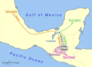 The territory of the Maya covered a third of Mesoamerica,[12] and the Maya were engaged in a dynamic relationship with neighbouring cultures that included the Olmecs, Mixtecs, Teotihuacan, the Aztecs, and others.[13] During the Early Classic period, the Maya cities of Tikal and Kaminaljuyu were key Maya foci in a network that extended beyond the Maya area into the highlands of central Mexico.[14] At around the same time, there was a strong Maya presence at the Tetitla compound of Teotihuacan.[15] Centuries later, during the 9th century AD, murals at Cacaxtla, another site in the central Mexican highlands, were painted in a Maya style.[16] This may have been either an effort to align itself with the still-powerful Maya area after the collapse of Teotihuacan and ensuing political fragmentation in the Mexican Highlands,[17] or an attempt to express a distant Maya origin of the inhabitants.[18] The Maya city of Chichen Itza and the distant Toltec capital of Tula had an especially close relationship.[19]