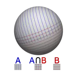 A slightly more difficult application of the Mayer–Vietoris sequence is the calculation of the homology groups of the Klein bottle X. One uses the decomposition of X as the union of two Möbius strips A and B glued along their boundary circle (see illustration on the right). Then A, B and their intersection A∩B are homotopy equivalent to circles, so the nontrivial part of the sequence yields[16]