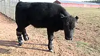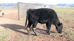 Meadow was born in northeastern New Mexico. She lost both of her back hooves to frostbite and was found badly wounded on a neighbor's property by Nancy Dickenson, who has helped over a dozen other animals that have been injured.[1] After seeing the serious injuries of the wounded calf, Dickenson wanted to give her the ability to walk again.[2]