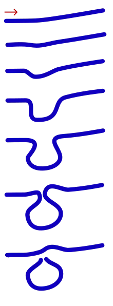 Meanders are a result of the interaction of water flowing through a curved channel with the underlying river bed. This produces helicoidal flow, in which water moves from the outer to the inner bank along the river bed, then flows back to the outer bank near the surface of the river. This in turn increases carrying capacity for sediments on the outer bank and reduces it on the inner bank, so that sediments are eroded from the outer bank and redeposited on the inner bank of the next downstream meander.[9]