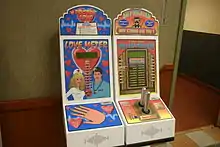 Fun measuring instruments: a Love Meter and strength tester machine at a Framingham, Massachusetts rest stop.
