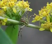 Like many members of the Thomisidae family, M. celer have the characteristic long front two pairs of legs and short back two pairs.[3] Adults show sexual dimorphism not only in size but in color, and mature males are often darker than females and have distinctive red bands on their legs.[5] Males also tend to have whiter abdomens with four or more pairs of brown spots that form a V-shape, starting from the mid-abdomen and terminating at end of the abdomen. The male body is also covered in noticeable dark hairs (setae). There can be difficulty in identifying M. celer from a male alone; males of M. celer appear quite similar to males of Mecaphesa dubia and Mecaphesa rothi, and due to natural variation in physical traits that can occur within a single species, distinguishing between these three species can be quite difficult.[7] Female M. celer, meanwhile, are more distinct from other species. They tend to be yellow in color and have large, round abdomens much larger than their heads, unlike the male, whose abdomen and head are roughly equal in size. Females can actually vary in their coloration, with one variant being a bright, solid yellow with barely any brown spotting, another variant being yellow with reddish-brown streaking on the abdomen, and a third variant being completely white with dull brown streaking on the abdomen.[7]