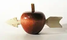 The apple and arrow in the picture are made of one piece of wood each. The hole is in effect too small to fit the arrow through it and there are no signs of gluing.
