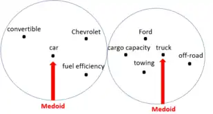 Medoids are representative objects of a data set or a cluster within a data set whose sum of dissimilarities to all the objects in the cluster is minimal.[1] Medoids are similar in concept to means or centroids, but medoids are always restricted to be members of the data set. Medoids are most commonly used on data when a mean or centroid cannot be defined, such as graphs. They are also used in contexts where the centroid is not representative of the dataset like in images, 3-D trajectories and gene expression[2] (where while the data is sparse the medoid need not be). These are also of interest while wanting to find a representative using some distance other than squared euclidean distance (for instance in movie-ratings).