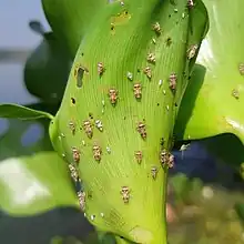Both adult and nymph M. scutellaris feed on the water hyacinth plants.[3] Adult females lay their eggs on the leaves and petioles of water hyacinth plants, and upon hatching, the nymphs feed on the plant tissues, moving through five instar stages before reaching adulthood. This feeding results in biotic stress and increases the plant's susceptibility to disease.[5] Under extensive feeding pressure, the plants may eventually succumb, causing them to sink and consequently leading to a decline in the water hyacinth population.
