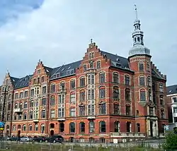 Mejlgade no. 7 from 1848 was built by Hans Wilhelm Schrøder in late classicist style.[8] No. 19 is Juul's House, a half-timbered 4-winged structure from 1629 in renaissance style. Juul's House has been a paint shop since 1842 and is the oldest paint shop in the country. Mejlgade 25 is a half-timbered building from 1585.[9] The 4 historicist buildings are the late-classicist houses in no. 43 from 1831 and no. 45 from 1864 in Empire style, no. 48 from 1864 and the classicist no. 52-54 from 1837.[10][11][12][13][14] Mejlgade No. 48 was home to Århus Stiftstidende and its printing press, in differing buildings, from 1794 until 1906 when it was turned into an elementary school.[6]