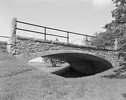 Von Emperger designed this bridge the same year to span a crossing over Dry Creek south of Rock Rapids. John Olsen, a builder from Rock Rapids, was contracted to build the structure. W. S. Hewett of Minnesota was the construction supervisor. The cement for the bridge was imported from Germany for $3.25 per barrel. It was mixed with sand and crushed jasper. The reinforcing is composed of five 4-inch (10 cm) beams that are embedded in a concrete rib that narrows to 6 inches (15 cm) at the crown.[3] The spandrels are faced with Sioux Falls Jasper. The total cost for the project was $830.[3] The narrow roadway made the bridge unfit for automobile traffic,[2] and it was removed in the early 1960s. Due to local public sentiment, the county and the state highway commission moved the historic structure to the park in 1964. It was listed on the National Register of Historic Places in 1974.[1]