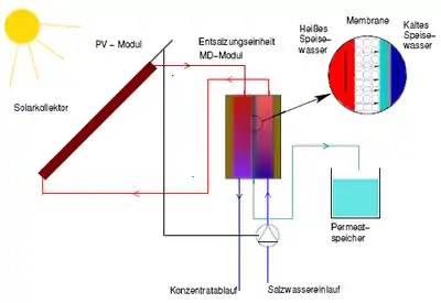 Membrane distillation is very suitable for compact, solar powered desalination units providing small and medium range output less than 10,000 litres per day (2,600 US gal/d).[22] Especially the spiral wound design patented by GORE in the year 1985 suits this application. Within the MEMDIS project, which kicked off in 2003, the Fraunhofer Institute for Solar Energy Systems ISE began developing MD modules as well as installing and analysing two different solar powered operating systems, together with other project partners. The first system type is a so-called compact system, designed to produce a drinking water output of 100–120 litres per day (26–32 US gal/d) from sea-or brackish water. The main aim of the system design is a simple, self-sufficient, low maintenance and robust plant for target markets in arid and semi-arid areas of low infrastructure. The second system type is a so-called two-loop plant with a capacity of around 2,000 litres per day (530 US gal/d). Here, the collector circuit is separated from the desalination circuit by a saltwater resistant heat exchanger.[7] Based on these two system types, a various number of prototypes were developed, installed and observed.