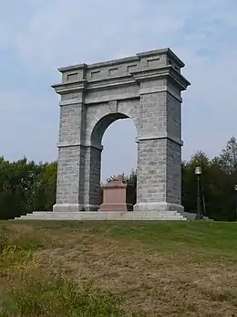 The Memorial Arch of Tilton is 55 feet (17 m) tall, 40 feet (12 m) wide, and is constructed of Concord granite. It sits atop a hill 150 feet (46 m) above the Winnipesaukee River, and its foundation goes into the earth 16 feet (4.9 m). At its base is a 50-ton sarcophagus and red granite "Numidian lion."[7] Tilton intended to be buried in this monument, but was not.[5] He was instead buried roughly a mile west, in Park Cemetery in Tilton.[2]