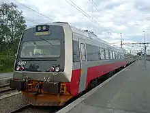 Norwegian State Railways operated two daily round trips between Heimdal Station via Trondheim Central Station to Storlien Station until March 2020. SJ Norge won the bid to run passenger trains on the line from June 2020 onwards.[40] At Storlien, passengers change to a regional train operated on the Central Line by Norrtåg. This served was marketed as Nabotoget ("the neighbor train") in Norway and Mittnabotåget in Sweden until 2012.[36] Travel time from Trondheim to Storlien is 1 hour and 44 minutes.[41] Most freight trains are lumber trains, hauling timber from Jämtland to the Norske Skog Skogn paper mill. There is also a train hauling limestone from Verdal to Örnsköldsvik.[37]