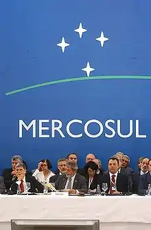 Venezuela's history in Mercosur began on 16 December 2003, during a Mercosur summit held in Montevideo, when the Mercosur Economic Complementation Agreement with Colombia, Ecuador and Venezuela was signed. This agreement established a timetable for the creation of a free trade zone among the signatory states and the full members of Mercosur, with a gradual reduction in tariffs. In this way, these countries were successful in negotiations for the formation of a free trade zone with Mercosur, since an economic complementation agreement, with full compliance with its schedule, is the item required for the rise of a new associate. However, on 8 July 2004, Venezuela was elevated to associate member status, without even completing the schedule agreed with the Common Market Council.[18][19][20] The following year, the bloc recognized it as an associated nation in the process of accession, which in practice meant that the state had a voice, but not a vote.