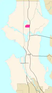 The neighborhood is bounded on the south by N 50th Street, beyond which is the rest of Wallingford; on the west by Green Lake Way N., beyond which is Woodland Park and Phinney Ridge; on the north by N 60th Street, beyond which is the Green Lake neighborhood, and on the east by Interstate 5, beyond which is the University District. Its main thoroughfares are Meridian Avenue N, Kirkwood Place N, and Latona Avenue NE (north- and southbound) and NE 56th Street (east- and westbound).