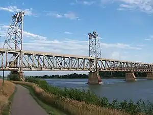 | Design | Vertical lift bridge double deck, Pratt through truss |