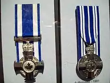 The Meritorious Service Decorations (French: Décorations pour service méritoire), available in two forms as the Meritorious Service Cross (Fr.: Croix du service méritoire) and the Meritorious Service Medal (Fr.: Médaille du service méritoire), are Canadian decorations awarded to those who have demonstrated an outstanding level of service or set an exemplary standard of achievement to benefit or honour Canada.[1] The decoration, awarded to both Canadians and non-Canadians and available in both military and civilian divisions, is awarded by the reigning Canadian monarch (currently King Charles III) and presented on his behalf by the Governor General.