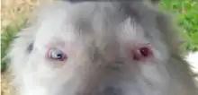 Dogs who are homozygous for the merle pattern gene often have visual and auditory deficits.[17] These dogs are sometimes referred to as 'double merle' and sometimes incorrectly referred to as 'lethal white'. Ocular defects include microphthalmia, conditions causing increased ocular pressure, and colobomas, among others.[24] Double merle dogs may be deaf or blind or both, and can carry ocular defects in blue or colored eyes.[25] Currently no studies have been done to prove whether or not the merle gene affects the eyes, causing blindness.
