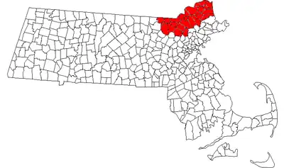 The Merrimack Valley area in Massachusetts is a community of towns and cities flanking the Merrimack River along the New Hampshire border, a portion of which is defined by a line approximately 3 miles (5 km) north and west of the Merrimack. The cities (marked with italics) and towns in this area are:[1][2]