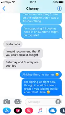 Messages received a new user interface in iOS 7. Apple also allowed users to see a message post date by swiping from right to left. In iOS 8, users can send audio and video messages by holding down the record button. In group conversations, users can remove/add someone to a thread, name a thread, share their location in a thread, view all attachments, and turn on Do Not Disturb to not receive notifications from a specific thread.[14] As a part of the new continuity feature, users can now use their iPhones as a relay to send and receive SMS and MMS messages on Macs and iPads. In iOS 9, the app received a redesigned overlay when sending an audio clip, as well as seeing contact photos in list view on iPhone 6 or later. In iOS 10, the app has its own App Store allowing the user to download third-party apps that allow users to send stickers and play games within the app.[15] It also received new visual effects, for example, chat bubbles with a "loud" or "gentle" effect.[16][17]