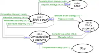 2. Using the notion of descriptors[6] as a means to describe process chunks. This eases the retrieval of components meeting the requirements of the user / matching with the situation at hand.[7] (Example Plihon 1995[8] in NATURE[9] and repository of scenario based approaches accessible on Internet in the CREWS project[10][11])