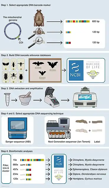 There are six stages or steps in DNA barcoding and metabarcoding. The DNA barcoding of animals (and specifically of bats) is used as an example in the diagram at the right and in the discussion immediately below.