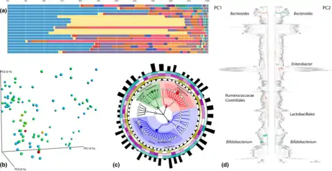 d) Edge PCA, a tree‐based diversity metric that identifies specific lineages (green/orange branches) that contribute most to community changes observed in samples distributed across different PCA axes.[50][51]