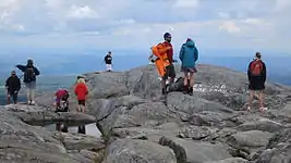 Weather along the route is typical of Massachusetts and southern New Hampshire, with slightly warmer temperatures in the Connecticut River Valley versus the upland plateau to the east. Conditions on exposed hill tops and summits may be harsher during cold or stormy weather.[15] Weather atop the exposed and isolated 3,100-foot (940 m) summit of Mount Monadnock can be much more severe than conditions below; high winds are common year round and winter storms on the summit can be life-threatening. Lightning is a hazard on exposed peaks and ledges during thunderstorms.[10] High flooding is common during rainy periods on the portions of trail that dip into the Connecticut River Valley and the Westfield River Valley, sometimes obliterating the trail. The Westfield River can be forded only during dry periods, and even then not without risk. The Connecticut River is not fordable; the trail terminates where it meets it (one must walk or drive to the Northampton Route 9 bridge or arrange for boat passage to the opposite bank).[1] Snow is common in the winter and may necessitate the use of cross country skis or snowshoes. Ice can form on exposed ledges and summits, making hiking dangerous without special equipment. Snow and ice tend to linger on Mount Monadnock well into the spring.[10]