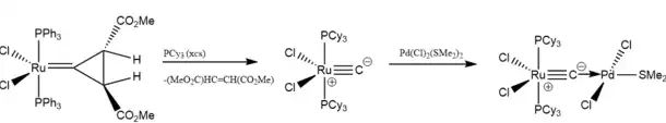 Metathesis using Grubbs-type alkylidene complexes can be used to synthesize terminal carbido-containing complexes. One example is RuC(PCy3)2Cl2 with a Ru-C distance of 163 pm, typical for a triple bond. [23]The complex can be obtained by metathesis of vinyl acetate to give [Ru(CH-p-C6H4Me)(PCy3)2Cl2] results in a metastable Ru(Cl2)(PCy3)2C2HOAc complex, which eliminates acetic acid. [24]