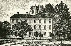 When the housing at the Mission Bottom was complete, the Indian Mission School was built to be used to teach the Native American children the ways of Western society.[3] Cyrus Shepard became the first teacher of the school in March 1835.[27] The students came from a variety of Native tribes, which over the years included Kalapuyas, Cayuses, Chehalis, Walla Wallas, Iroquois, Shastas, Tillamooks, Klickitats, Umpquas, Chinooks, and even Hawaiians.[11] Additionally there was participation from the children of the French-Canadian settlers and Native wives.[3] Besides being the main source of labor for maintaining the growing farms, the students also hunted game for the mission.[11] The initial class had 14 Native students though during the summer upwards of 40 were in attendance.[4] Over the years illness from exposure to new diseases killed many students, and some ran away.[26] Relatives of deceased students sometimes blamed the Methodists and occasionally attempted to get revenge, though no acts of violence have been recorded.[4] Shepard died on January 1, 1840,[30] and the school went into a decline without his teaching abilities.[20] The school was relocated to the Mission Mill in 1842 in a building under construction with a budget of $40,000 planned to accommodate upwards of 300 students.[10]