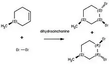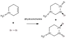 In the presence of a Cinchona alkaloid, bromination of an alkene leads to optically active dibromides.[7] For 4-methylcyclohexene, the (S)-configuration leads to two different products: the bromines can add at the axial positions, giving the orientation (1S:3R:4R), or at the equatorial positions, giving the orientation (1S:3S:4S). Similarly, the (R)-configuration produces two different products: axial addition yields the configuration (1R:3S:4S) and equatorial addition yields (1R:3R:4R).