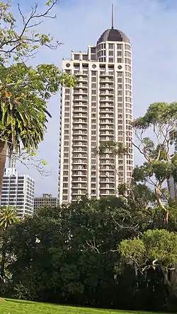 Metropolis is a 40-storey residential / hotel skyscraper in the Auckland CBD of Auckland, New Zealand,[3] developed in 1999 by Krukziener Properties. Commended for its style and quality, the NZ$180 million cost of its construction also led to major financial fallout.[4] Metropolis is considered one of Auckland's most exclusive apartment buildings,[5] and it was the tallest residential building in New Zealand until 2020 when the nearby Pacifica was completed.