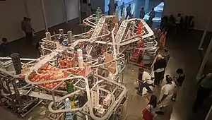 A smaller predecessor, Metropolis I (2004), is in Japan at the 21st Century Museum of Contemporary Art, Kanazawa.[10] Measuring 7 ft × 16 ft × 11 ft (2.1 m × 4.9 m × 3.4 m), that sculpture employs about 80 Hot-Wheels cars, which tend to fall off the track.[2] Metropolis II cars are custom built and use magnets for traction. Burden's name is on the tire sidewalls.[1][11][9]