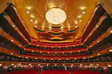 The auditorium is fan-shaped and decorated in gold and burgundy with seating for 3,794 and 245 standing positions on six levels. Over 4,000 squares of gold leaf cover the domed petal-shaped ceiling from which the 21 crystal chandeliers hang. The walls of the auditorium are paneled in kevazingo bubinga, a rosewood noted for its acoustic quality. The auditorium is known to be acoustically significant—small conversation and quiet moments in music can be heard well at the top of the Family Circle some 146 feet (45 m) away from the stage.[17] As a result, the Opera House is the only Lincoln Center auditorium that has not been rebuilt because of acoustic problems. The square gold proscenium is 54 ft (16 m) wide and 54 ft (16 m) high. The main curtain of custom-woven gold damask is the largest tab curtain in the world. Above the proscenium is an untitled bronze sculpture by Mary Callery.[17] The orchestra pit is very large and open to the auditorium, with the capacity for up to 110 musicians.