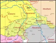 Meuse-Rhenish (German: Rheinmaasländisch, Dutch: Maas-Rijnlands, French: francique rhéno-mosan) is the modern term for literature written in the Middle Ages in the greater Meuse-Rhine area, in a literary language that is effectively Middle Dutch. This area stretches in the northern triangle roughly between the rivers Meuse (in Belgium and the Netherlands) and Rhine (in Germany). It also applies to the Low Franconian dialects that have been spoken in that area continuously from medieval times up to now in modern times in a non-literary context. It includes varieties of South Guelderish (Zuid-Gelders) and Limburgish in the Belgian and Dutch provinces of Limburg, and their German counterparts Low Rhenish (German: Niederrheinisch) including Bergish in German Northern Rhineland. Although some dialects of this group are spoken within the language area where German is the standard, they actually are Low Franconian in character, and are more closely related to Dutch than to High German, and could therefore also be called Dutch (see also Dutch dialects). With regard to this German part only, Meuse-Rhenish equals the total of Low Rhenish vernaculars.