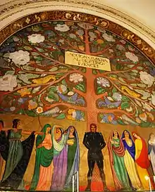 While most commissioned art was for churches, secular works were commissioned as well. Portrait painting was known relatively early in the colonial period, mostly of viceroys and archbishops, as well as the conqueror Hernán Cortés. Portraits of royal and ecclesiastical officials were an approximation of the sitter's appearance, and were displayed in their official settings. They often included their coats of arms. In the sixteenth-century portrait of Cortés, the conqueror is portrayed with a baton, sword, and armor "symbolize political and military might, but the discarded glove helmet and glove reveal that his warring activities are completed."[41] Portraits of viceroys and ecclesiastics were often portrayed in rich clothing and writing implements, along with their coats of arms indicating their genealogy and high standing as well as books and writing implements. In Mexico, there are few exemplars of royal officials from before the eighteenth century, perhaps because the 1696 riot destroyed the portrait gallery in the viceregal palace.[42]